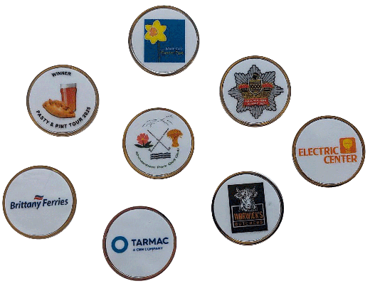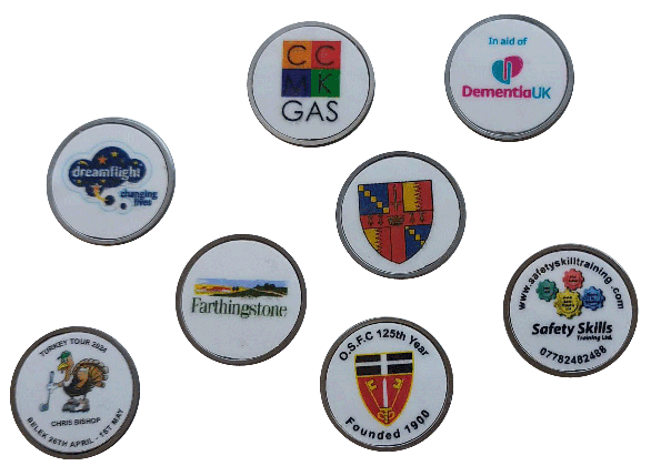 25 mm stainless matt or bright finish ball marker disc with full colour decal insert bearing your company logo, crest or other image, even a photo or individual names.