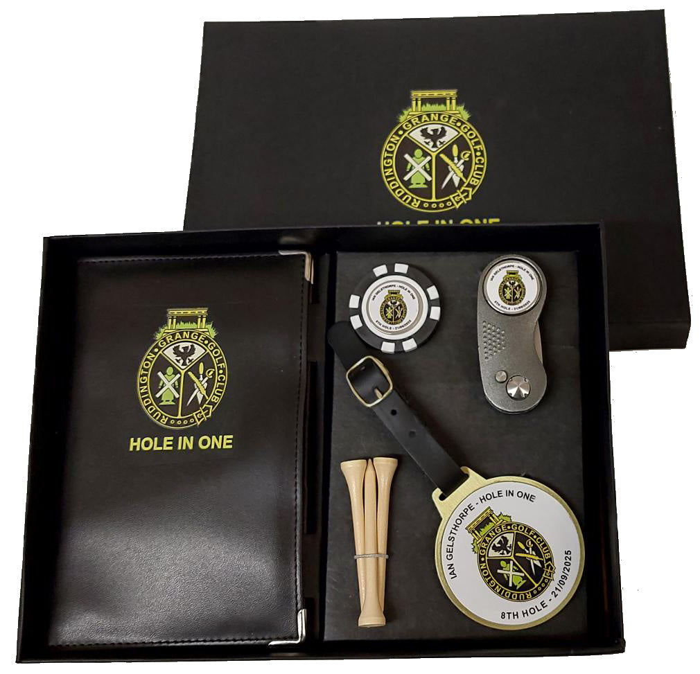 Contents are a faux leather scorecard holder, an antique gold metal bag tag, a magnetic Flick Pitch fork in a choice of 9 colours with a Turnberry marker, a magnetic casino chip again with a Turnberry marker, and 3 plain 70mm wooden tees.