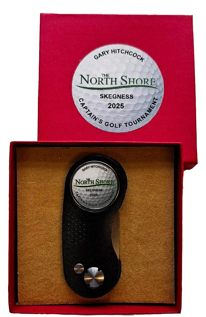 Available in 9 different colours as shown below main image, this fork with the retractable spike also holds a removable 25 mm Turnberry flat ball marker. We can even add the recipients name to make it really special. Call to confirm price. We can mix the colours especially if required for competing teams and if you would like the fork in a personalised gift box see pack 20 in the GIFT PACK section.