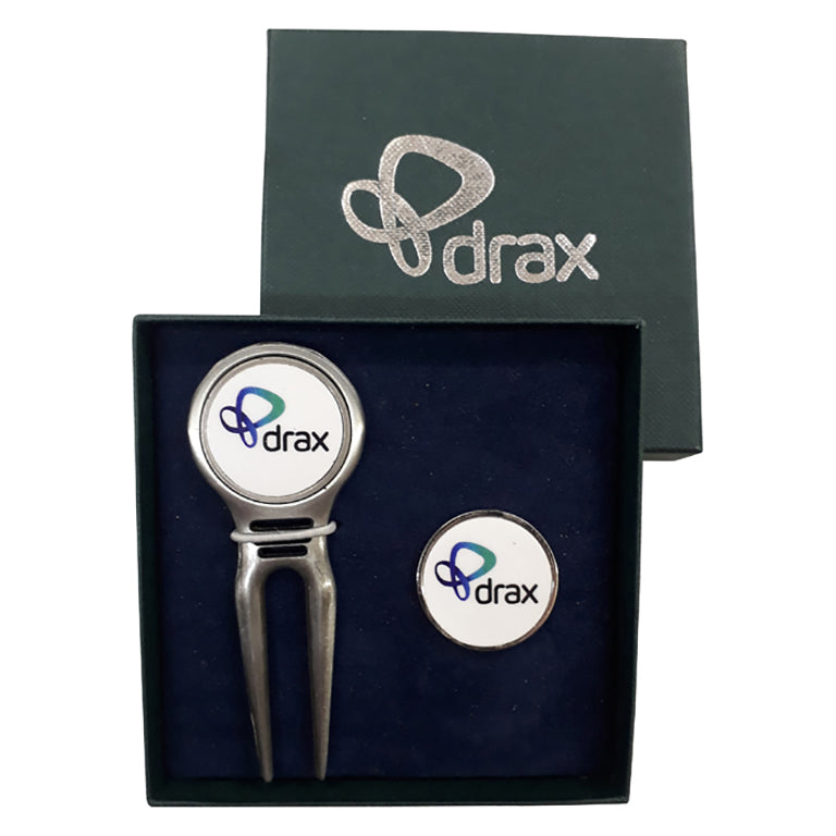 Our brushed stainless steel metal pitch repairer comes with a magnetic recess in head holding a flat 25 mm ball marker disc with a full colour crest, logo or photo.