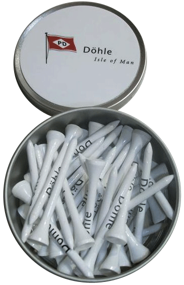 95 mm tin with full colour logo on lid holding 40 plain 54 mm wooden tees.